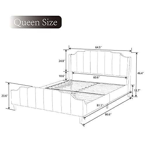 Chic modern velvet upholstered bed with high profile ribbed tufted headboard and low profile foot board.